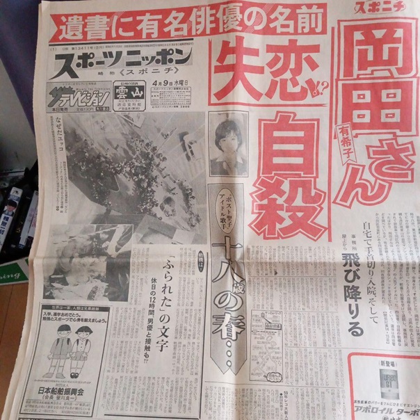 てか、フラれたら自死すんのかよ。それ、マジでさ、岡田有希子の前世はどんな身分だったんだよ?普通の身分なら、自分の思い通りにならないことだらけだったから、この程度のことで自死する訳ねーけどなあ。きっと高貴な身分で、何でもかんでも自分の我儘を叶えてくれる環境だったのかなあ?アホ草。