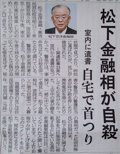 けっこうな大物国会議員も、恥に対する耐性は無かったらしい。てかよ、もう歳なんだからね、これを機に引退して、あとはゆっくりと自宅で過ごせば良かったのに。もう73歳だろ?金も議員年金をたっぷり貰える立場だったのだから、首吊り自殺などせずに、隠居すればよかったのに。