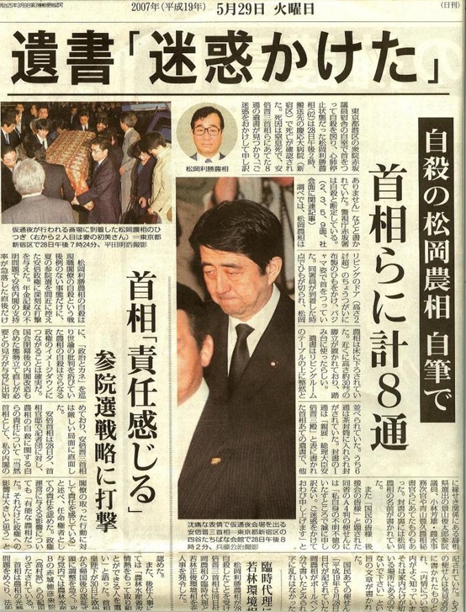 現役の農林水産大臣だった松岡利勝大臣が自死したニュース。コイツはね、金を捻出する為に、安売りの水のペットボトルなのに、なんとか還元水という魔法の仕組みで、金を生み出していたらしい。ん?違うか。そもそもペットボトル自体無いのか。全て架空の発注でしたか。なんか一本5000円とか6000円とか記載して、その存在しない架空の何とか還元水なる商品を大量に発注したということにして、税金を詐取していたらしい。それがバレて、警察に逮捕されて正式に、法的に犯罪者になるのが嫌で、自死したのだ。アホ草。まあ、もう既に悪事を働いていた段階で、たとえ警察に逮捕されていなくとも、犯罪者なんですよ、松岡のとっつぁん!