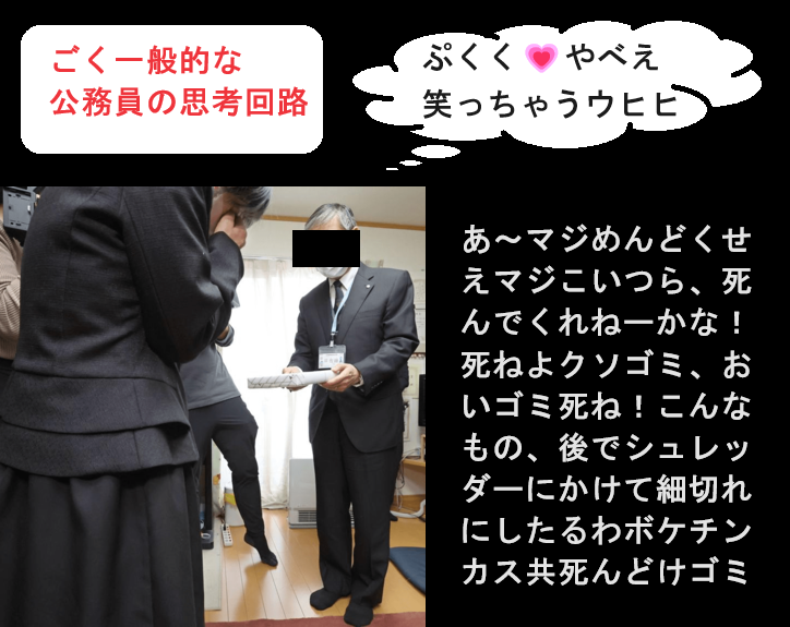 マジで公務員なんぞに頼っても、意味がないぞ。何も変えないのが公務員だから。だって、何もしなくても、会社員と違って倒産して失業する危機なんてねーしよ。だから何もしないの!安定第一!その安定を乱す輩は、徹底的に排除するのん!仮に、たま~に改革の熱意に燃える公務員が一人や二人現れたところで、ヘドロうんこみたいに精神が死んじゃってるおじさん公務員連中が、徹底的に潰すからね~!出る杭は殺します、はい、公務員!