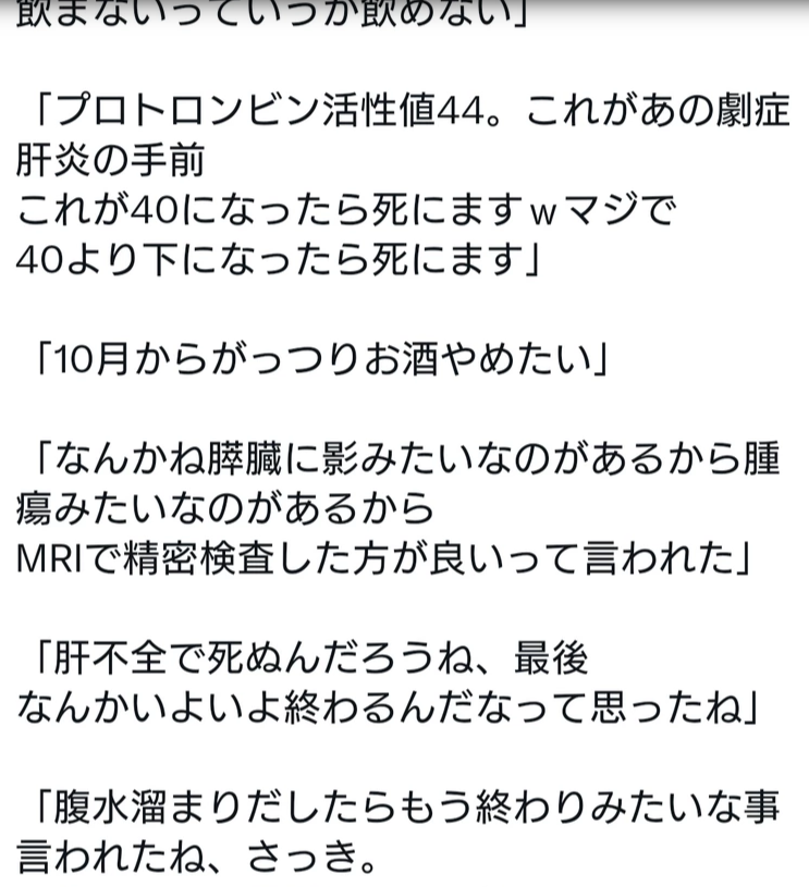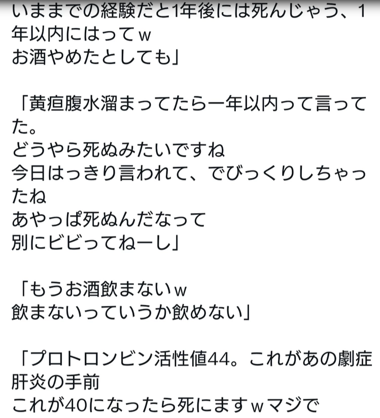 もう、肝臓の数値が悪化し過ぎているので、酒はもう飲めないらしい。まあ、この時点で断酒しても、もう遅いんですけどね。金持ちでもねーから臓器移植も無理だしな。てか、臓器移植で助かるのか?てか、元々自殺志願者みたいなものだし、どうせ臓器移植したとしても、また酒浸りの生活に戻るのだから、このまま死なせてあげたほうがいいんちゃうのん?臓器を提供する方も、もっとマシな人に肝臓を提供したいだろうしな。