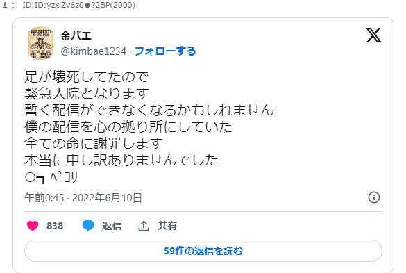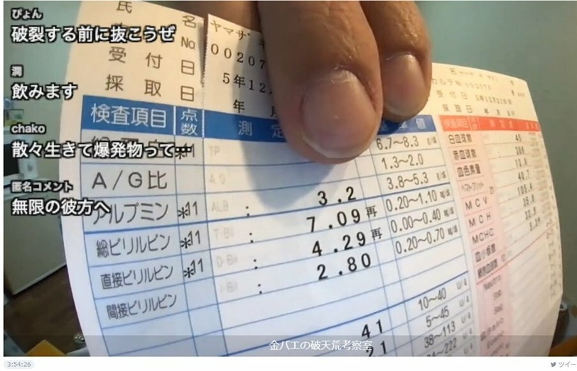 医者から余命一年の宣告を受けたニコ生配信者の金バエさん。