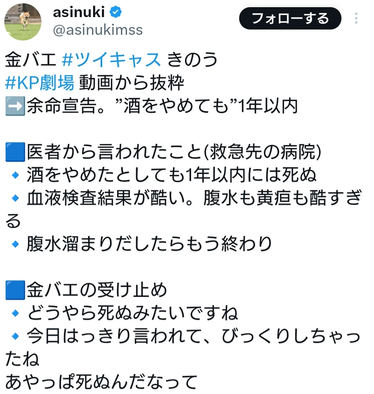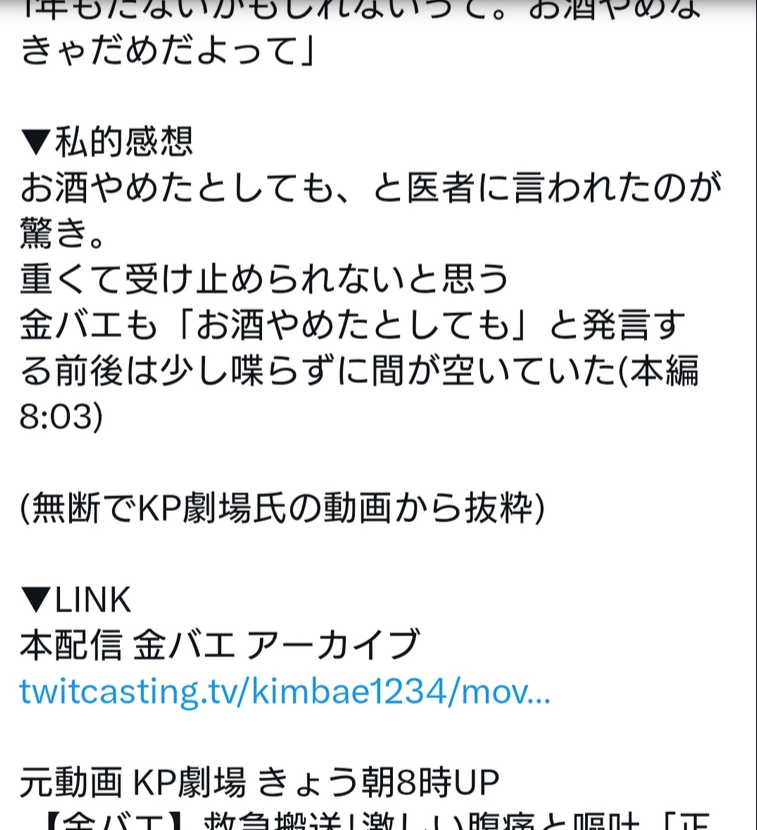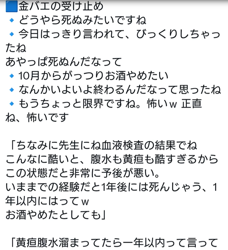 んで、2023年の9月末、服薬後にみぞおちの左側が痛くなり嘔吐した。そして救急車へ。んで、診断結果は、腹に水が大量に蓄積していると。んで、腹水も黄疸も深刻であると。んで、医師としての経験上、一年以内に死ぬと言われたらしい。今から断酒しても状態はもう、多分改善しないだろうと言われたとさ。