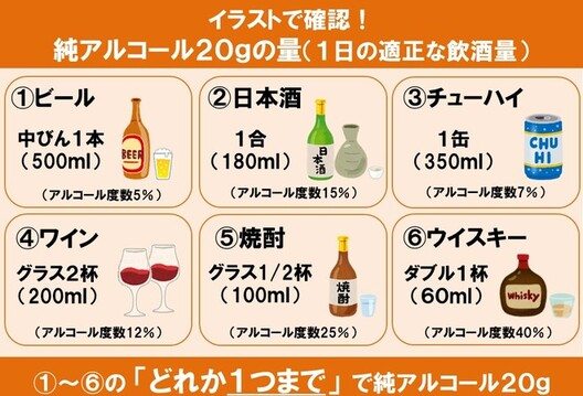 まあ、厚生労働省が適度として発表している純アルコール量は、1日平均20gらしい。ただ、これも、この容量を守れば病気にならないという目安ではない。この容量以内でも十分に病気になる。まあ、当たり前なのだが、肝臓と体の為には、飲酒量はゼロが望ましいらしい。